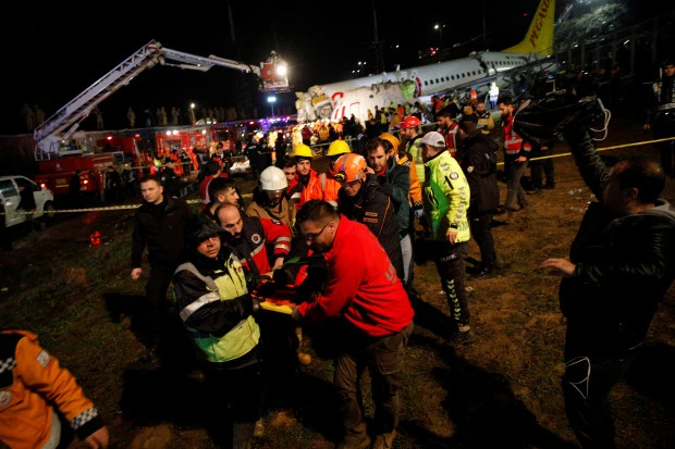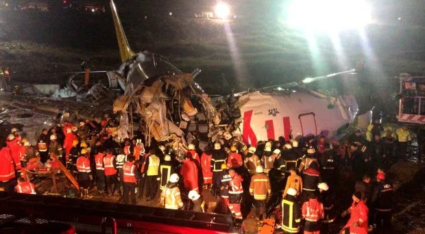 A passenger jet, which was flying from Izmir in Turkey to Sabiha Gokcen airport, snapped into three parts and burst into flames at the end of a runway, leaving three people dead and 179 injured.