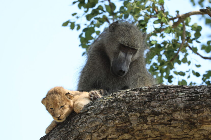 In a recent incident, the tour guide witnessed a large group of monkeys gathering beneath the tree on which a baboon has taken a lion cub.