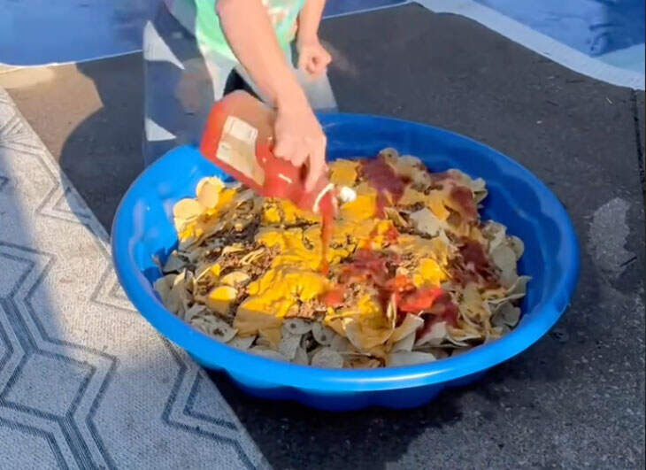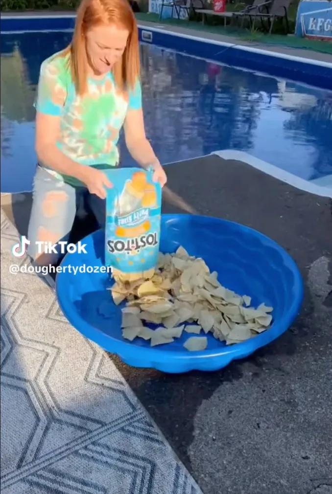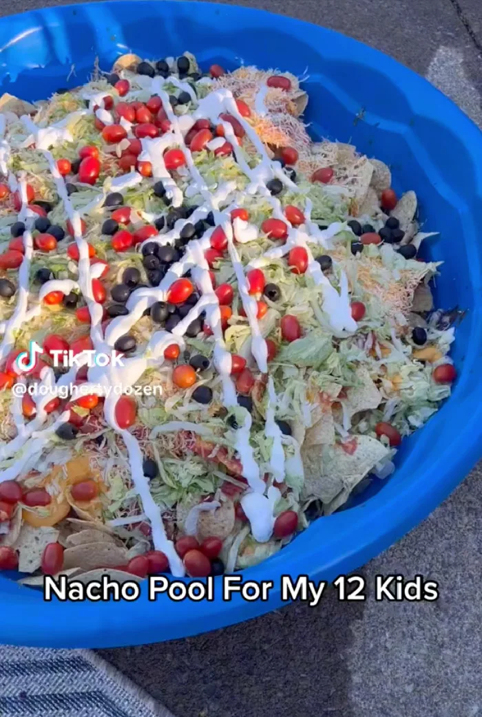 Her viral TikTok shows her pouring in bags and bags of Tostitos chips into a baby pool before covering them with ground meat, salsa, nacho cheese, grated cheese, olives, cherry tomatoes, lettuce, and sour cream.