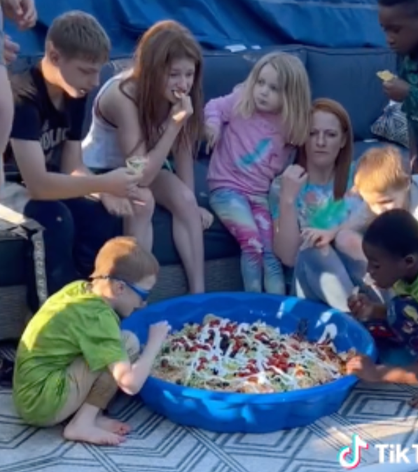 A mother-of-twelve has been slammed on social media for serving her kids a giant portion of nachos in a kiddy pool.