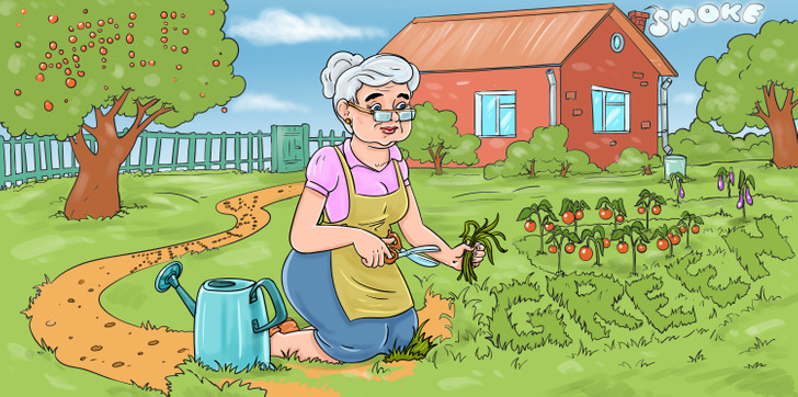 The image shows a grandmother tending to her garden. It seems like she’s delighted with the results of her hard work as her tomatoes and eggplants are growing properly!