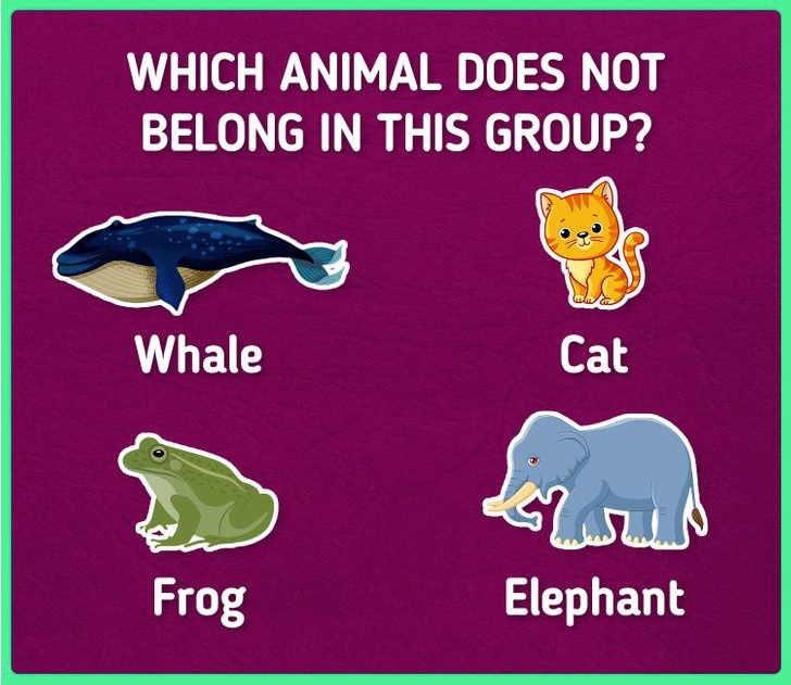 In the picture above, you can see four animals including a cat, an elephant, a frog, and a whale. While these animals don’t have all that much in common, only one of them doesn’t belong in the group.