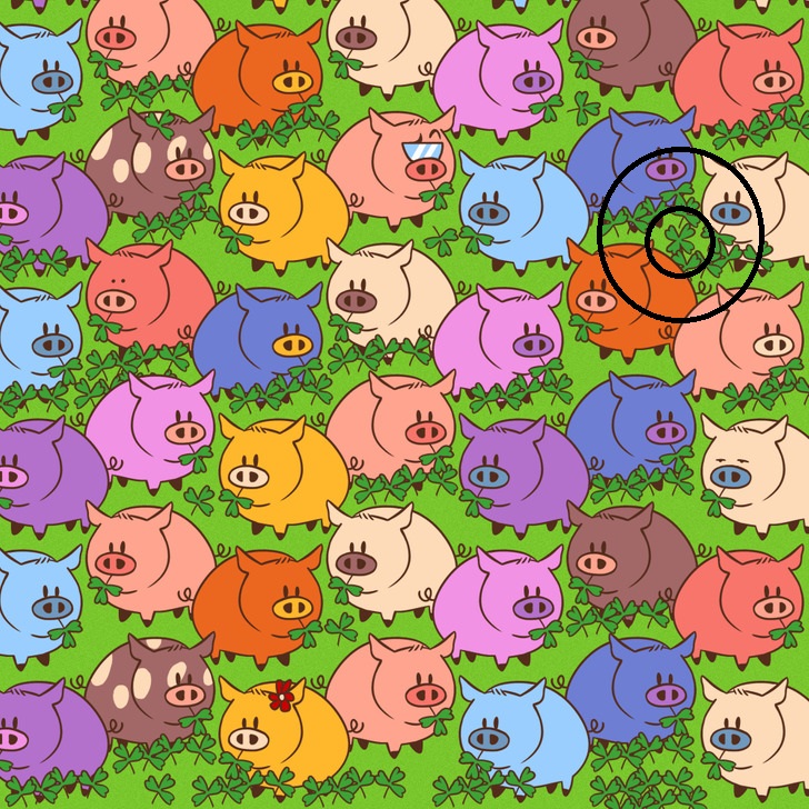 In the second puzzle, you will see a group of colorful piglets that are chewing on clovers. All of the clovers appear identical, but one of them is different. Find the odd one out!