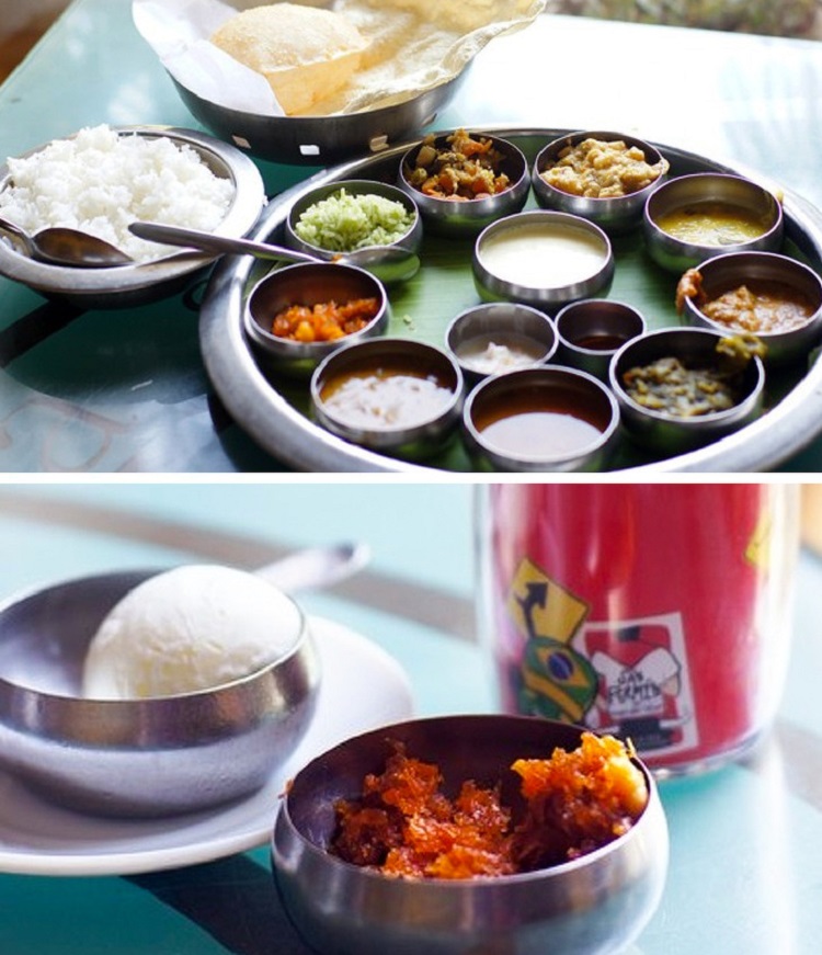 The Thali is the standard Indian lunch. It involves a waiter bringing a dish with metal plates that are put on the table. Sauces are added to the rice any which way you want. Sweets and tea cap off the meal. Indians just love taking tea with milk and a lot of sugar.