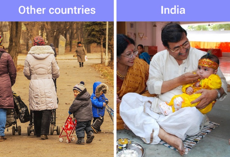 Indian families have 2-3 children on average and are devoted to them. Parents dress their kids in different clothes, take them to cafes and restaurants, and walk with them in the evening.