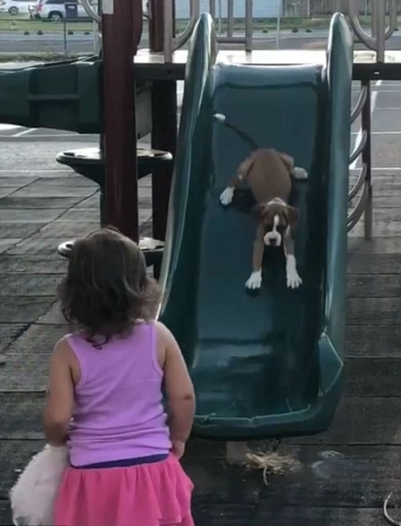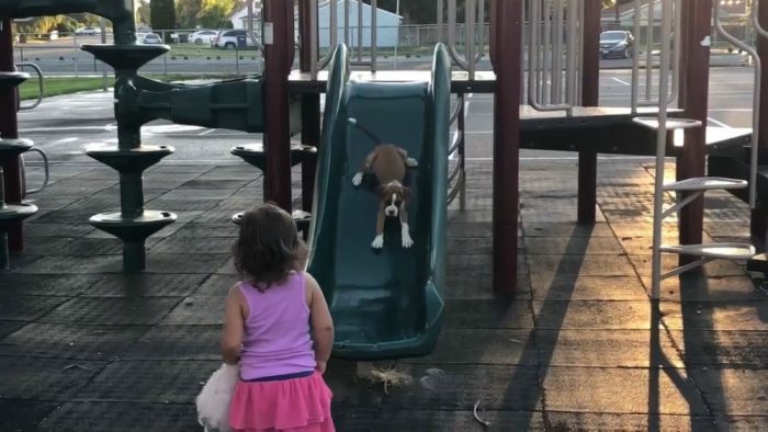 The adorable video of two-year-old Evelyn Trevino from Washington teaching her terrified Boxer puppy how to use a slide is doing rounds on the internet with people going crazy over the little girl’s cuteness.