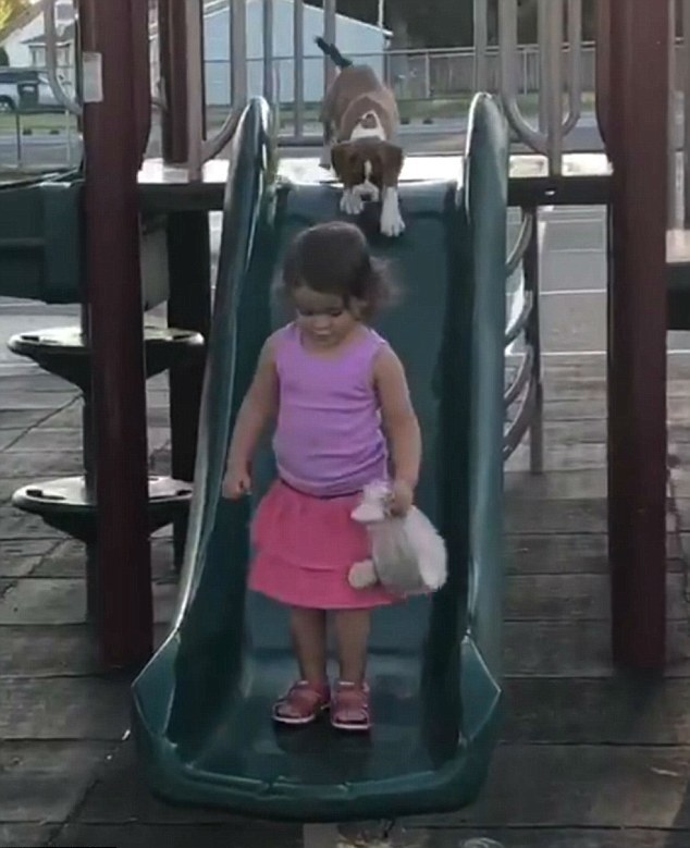 Evelyn was caught on camera playing with Franny, her boxer pup. She is seen showing Franny how to use the green slide.