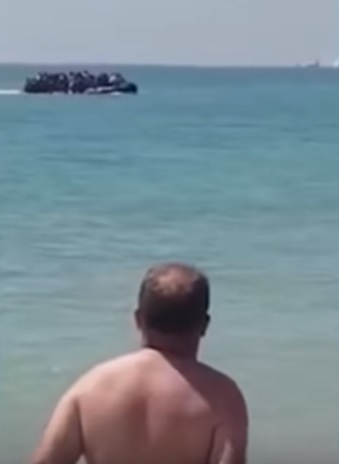 The tourists can be heard saying something in Spanish, totally surprised as the refugees leaped from their vessel, Zodiac.