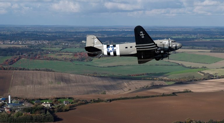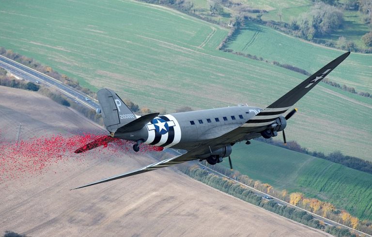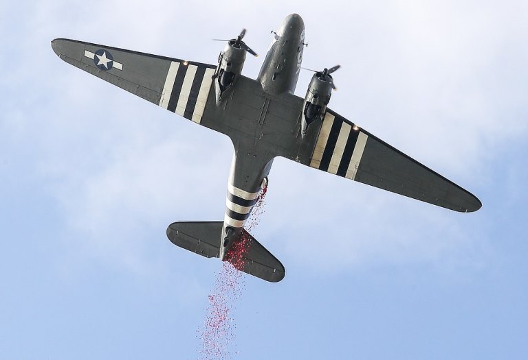 The Second World War Dakota dropped the gentle flowers as it flew above the English coastline.