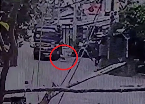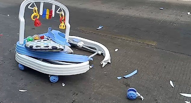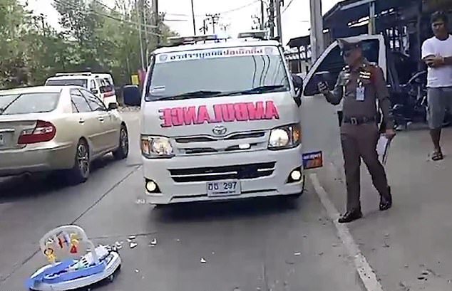 In footage of the incident that occurred in Thailand, the baby walker with the 8-month-old inside is seen rolling into the path of a truck.