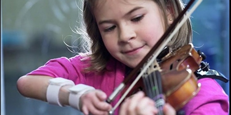 For the past 3 years, Nickie has been playing the violin and her disability did not stop her from excelling at it. Thanks to a custom device designed by bio-mechanic specialists, Nickie can attach a bow to her small arm to use it to play notes.