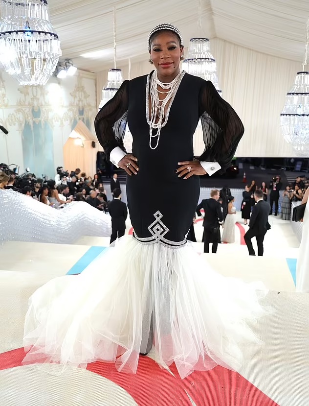 Taking to the red carpet at NYC’s Metropolitan Museum of Art, the athlete sported a black Gucci dress with angular rhinestone trim around the sleeves and on the hem. Williams completed the look by donning a jeweled headband and a series of thick pearl strands around her neck.