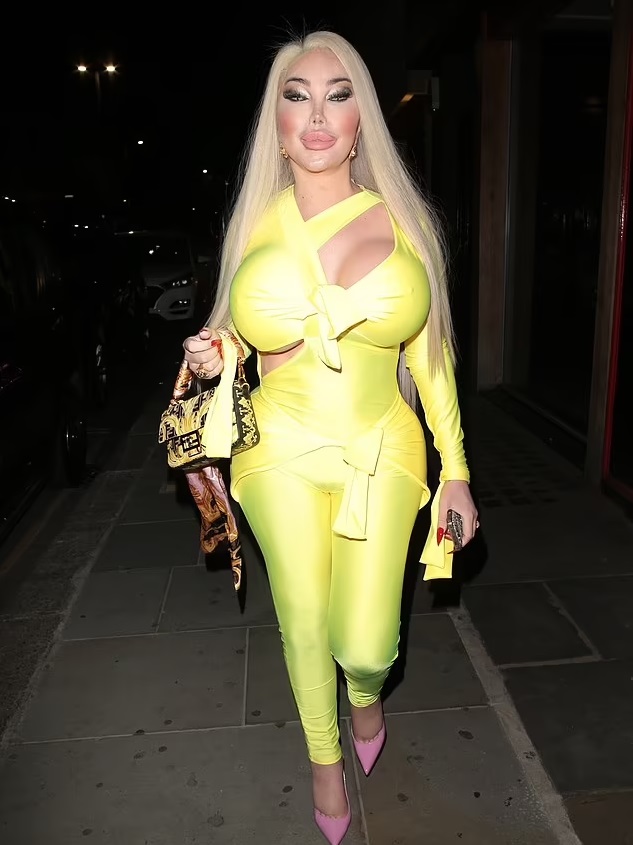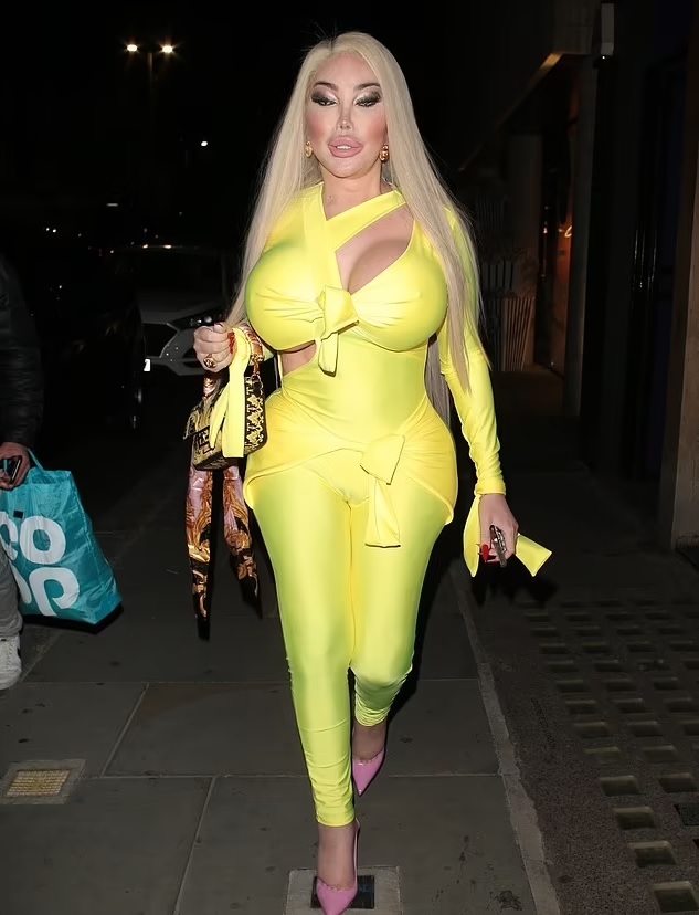 Sporting a neon yellow one-piece ensemble with a plunging neckline, Alves showed off her incredible figure which is a result of dozens of cosmetic procedures including a very recent boob job.