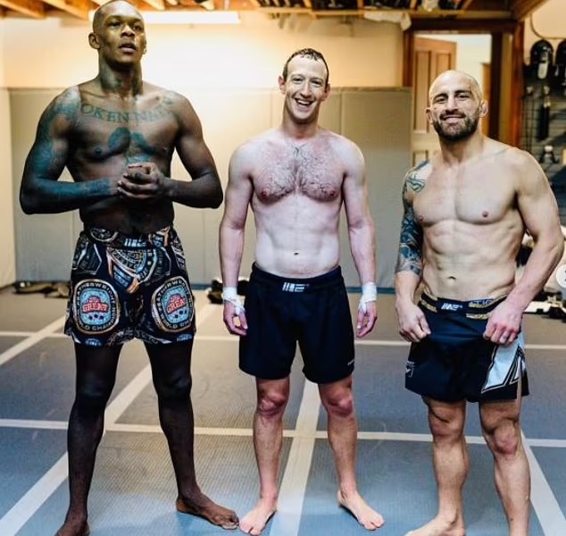 In one picture, the Facebook mastermind flexed his abs and veiny arms as he posed alongside two-time UFC Middleweight champion Israel Adesanya and UFC Featherweight Champion Alex Volkanovski.