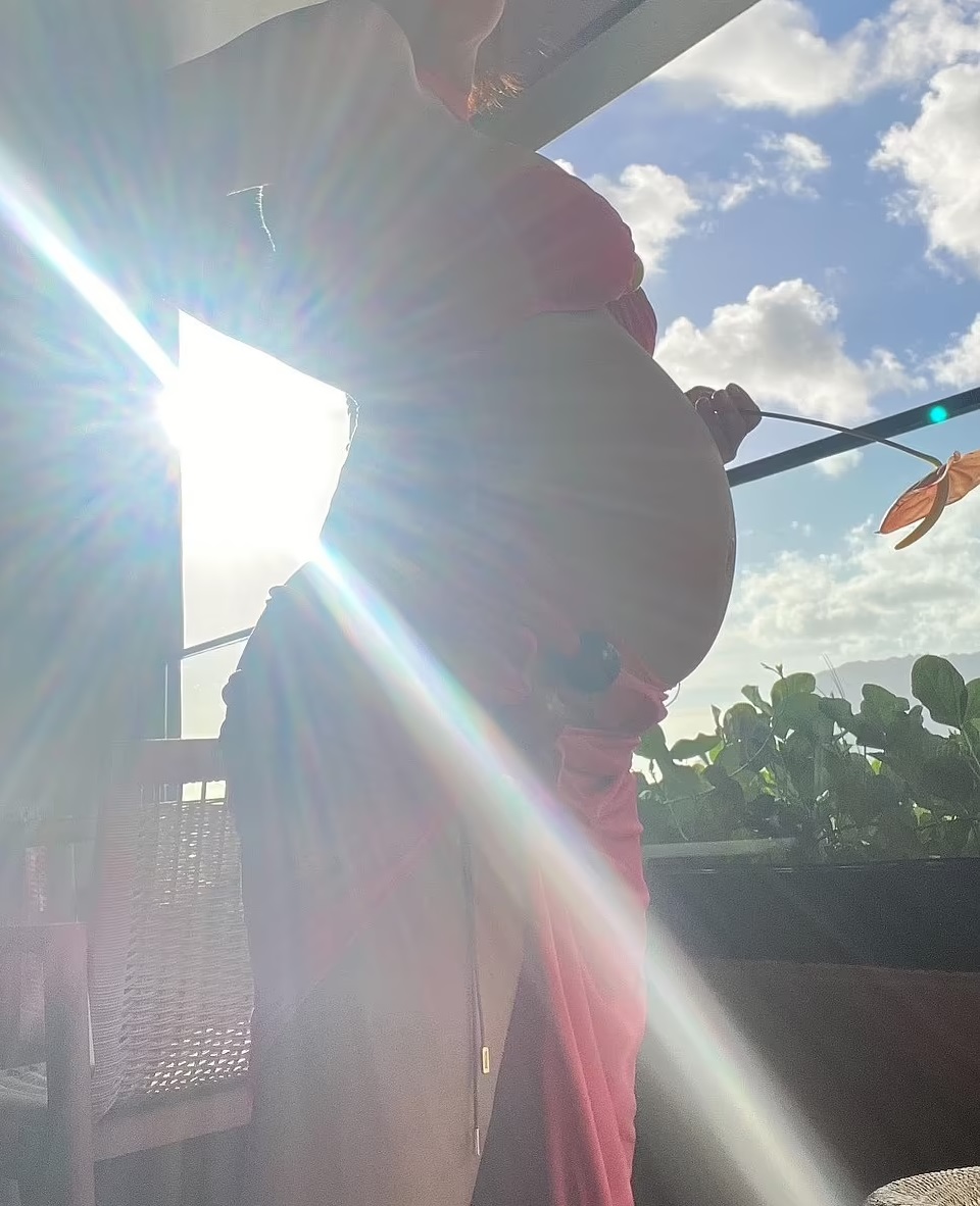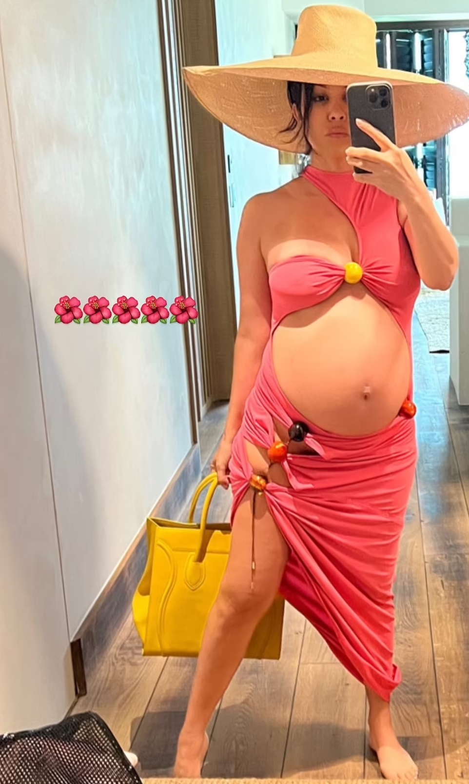 The 44-year-old TV star looked beautiful and content as she posed for a series of pictures in a pink cut-out dress while enjoying her babymoon in the Paradise of the Pacific.