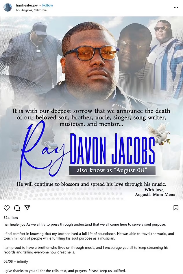“It’s with our deepest sorrow that we announce the death of our beloved son, brother, uncle, singer, songwriter and mentor… Ray Davon Jacobs… also known as August 08,” LaSherry McKinney posted.