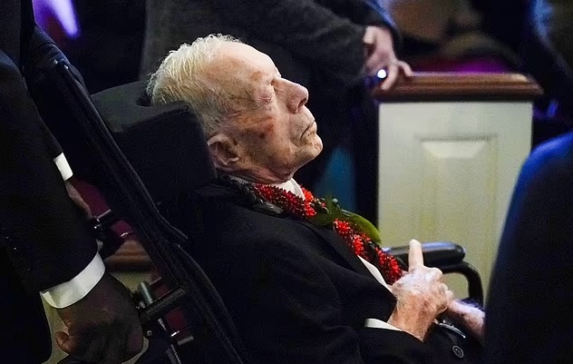 The former president, 99, attended the service in a wheelchair after it was revealed he left hospice care because he didn’t want to miss the funeral of his wife of 77 years.