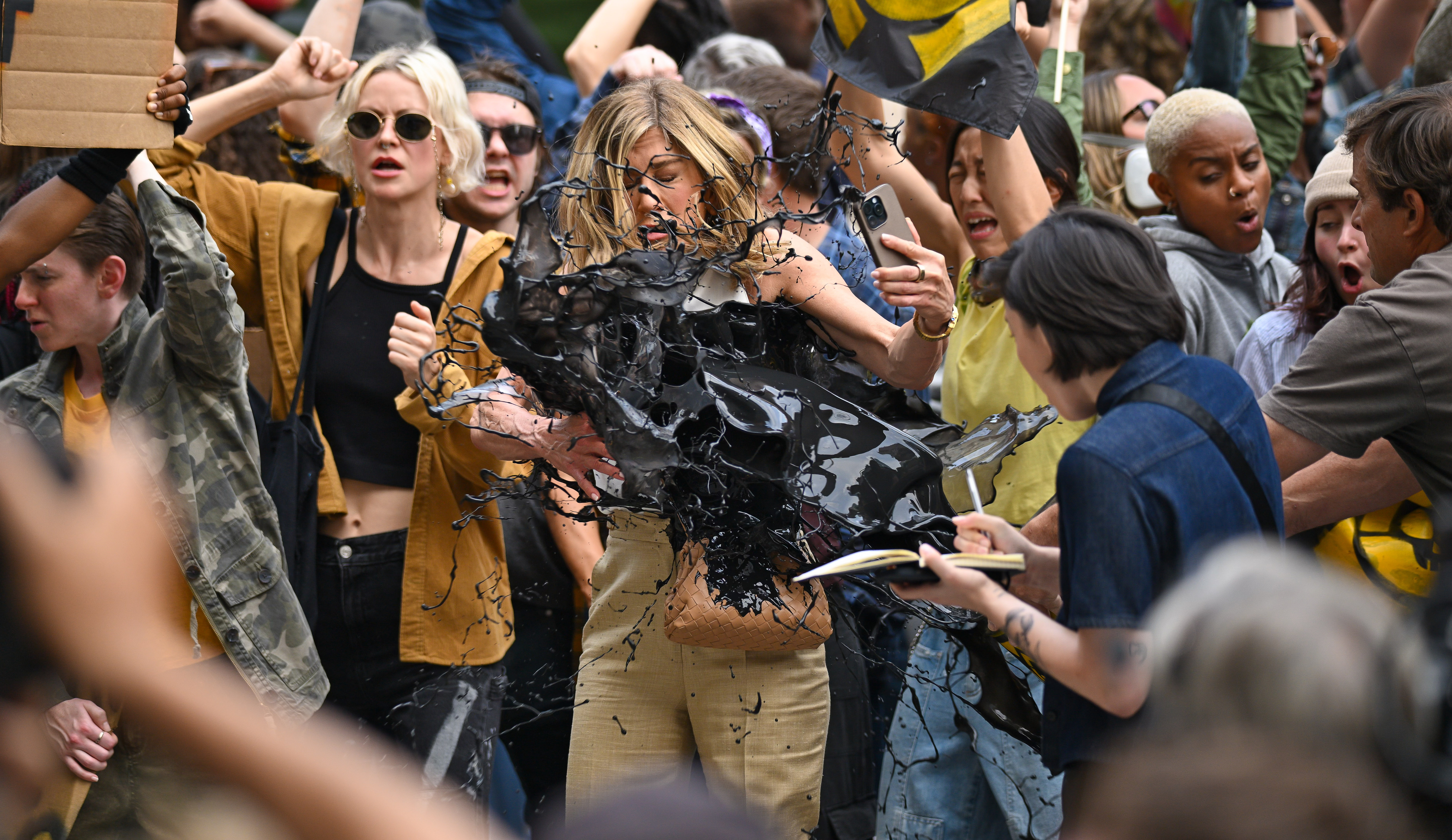 And that’s when she’s blasted with a giant helping of fake oil. Moreover, images of the leading Emmy-winning star in character going through a made-up protest environment had many confused online.