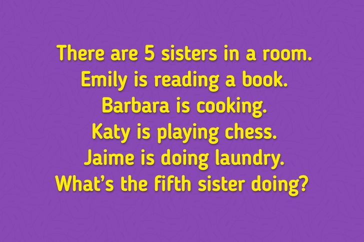 The riddle says there are five sisters inside a room. Emily is reading her book while Babara is busy cooking. Katy is busy playing chess and Jaime is enjoying her laundry session. Now the question to ponder over is what the fifth sister is doing.