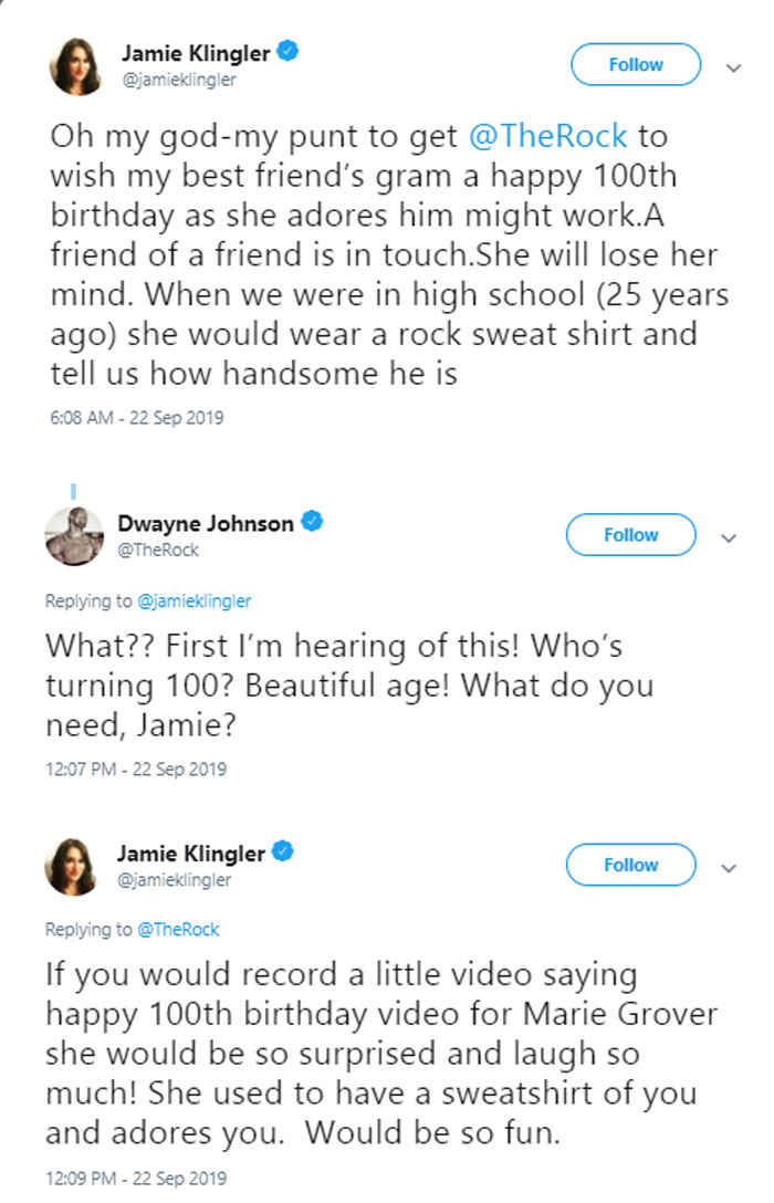 A woman named Jamie Klingler wrote on Twitter that her best friend’s grandmother Marie Grover would be celebrating her 100th birthday and she is a huge The Rock fan.