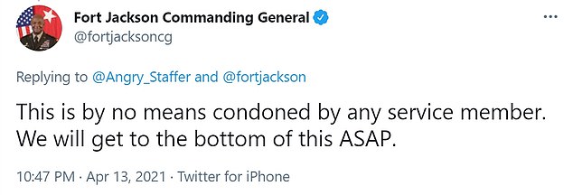 Commanding General Brig. Gen. Milford Beagle, Jr, tweets: “This is by no means condoned by any service member, We will get to the bottom of this ASAP,”