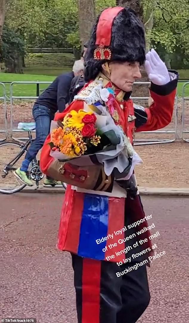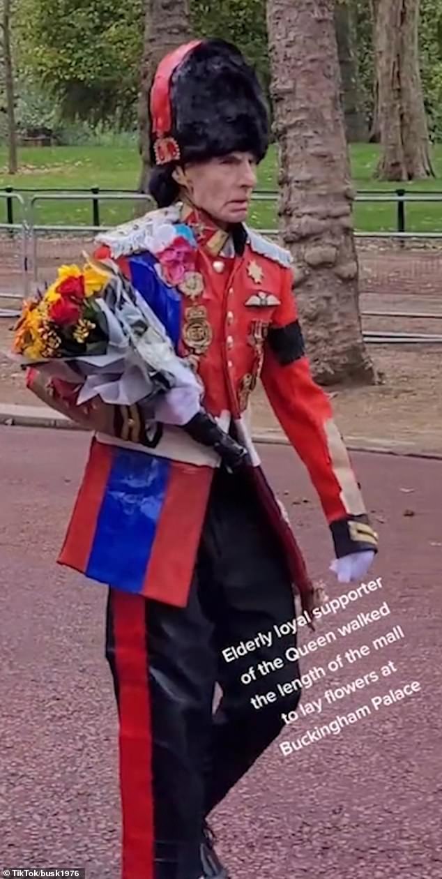 An elderly gentleman is being called out on social media for displaying the utmost love and devotion for the Queen. And if that means walking the length of the mall in a Royal Guard costume to lay a tribute of flowers for her, then so be it.
