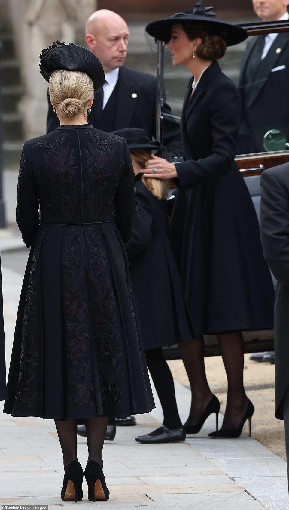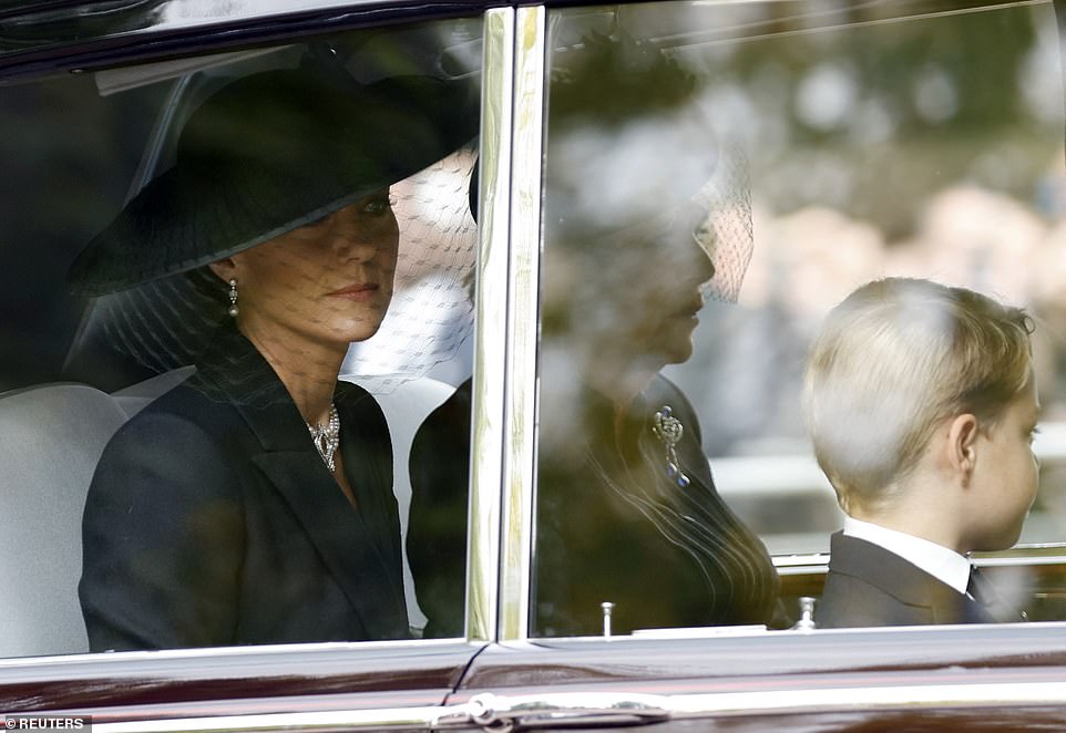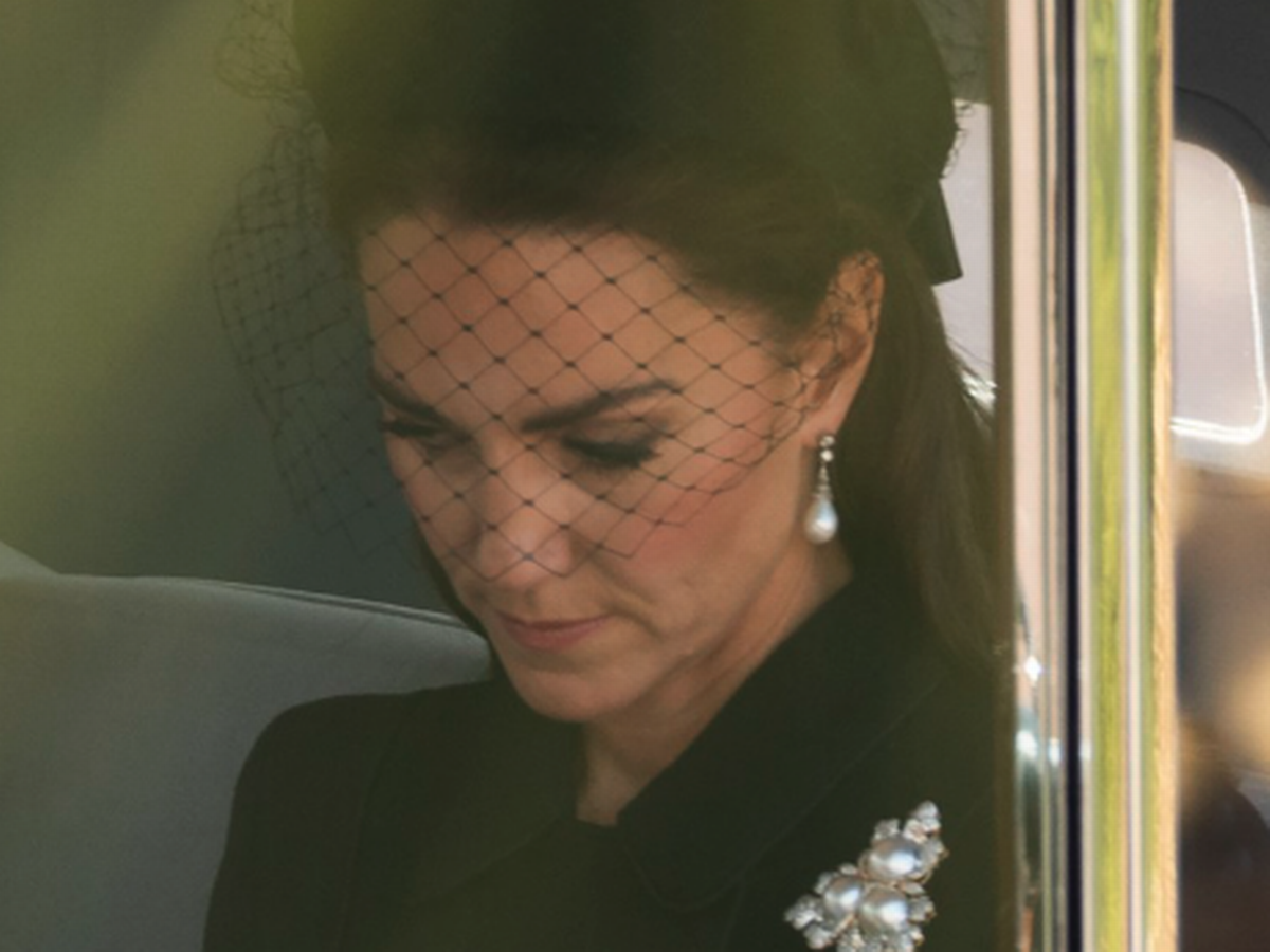 The 40-year-old was called out for adding statement pieces of jewels to her attire that represented both Princess Diana and the Queen. She was pictured traveling to Westminster Abbey for the funeral with her kids, George and Charlotte.