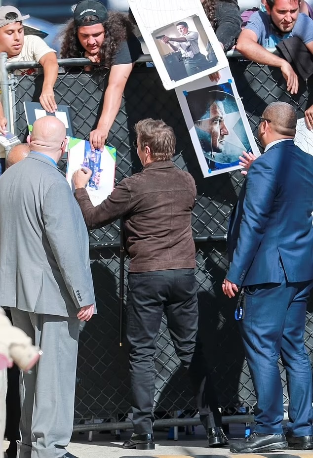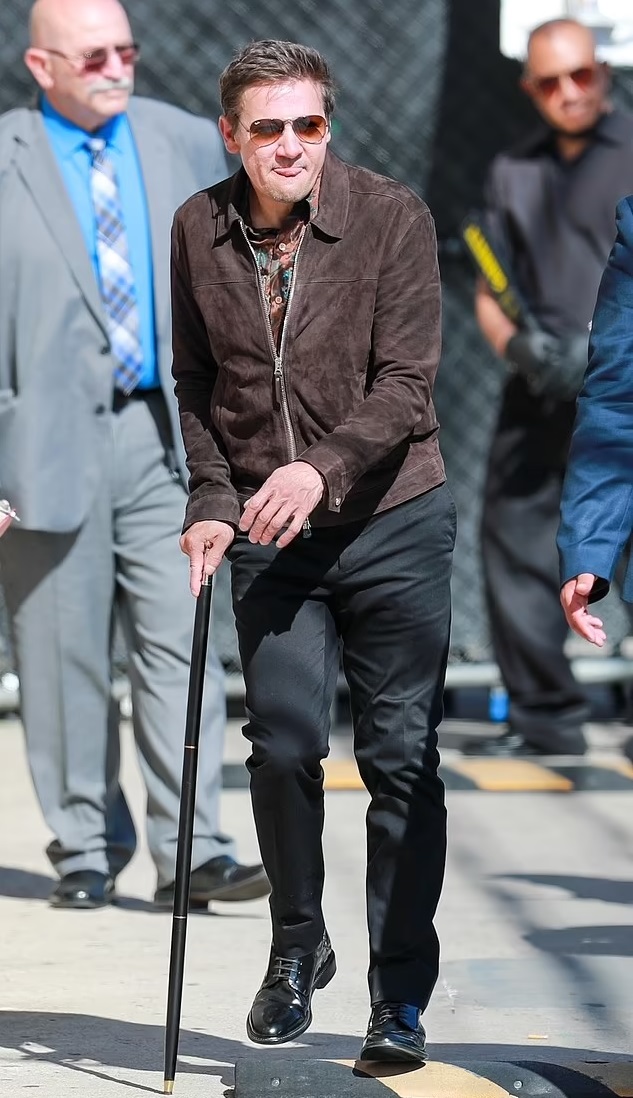Leaning on his walking cane while sporting stylish shades, Renner smiled from ear to ear as he was escorted to the late night show studio in dark brown suede top and black pants.