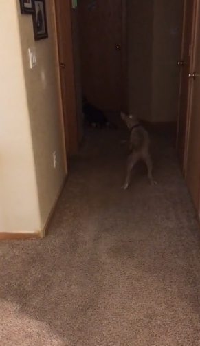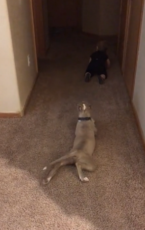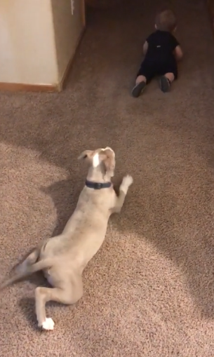 Recently, a baby pitbull decides to crawl just like the baby in the house. It is a funny video as the puppy was crawling behind the baby.