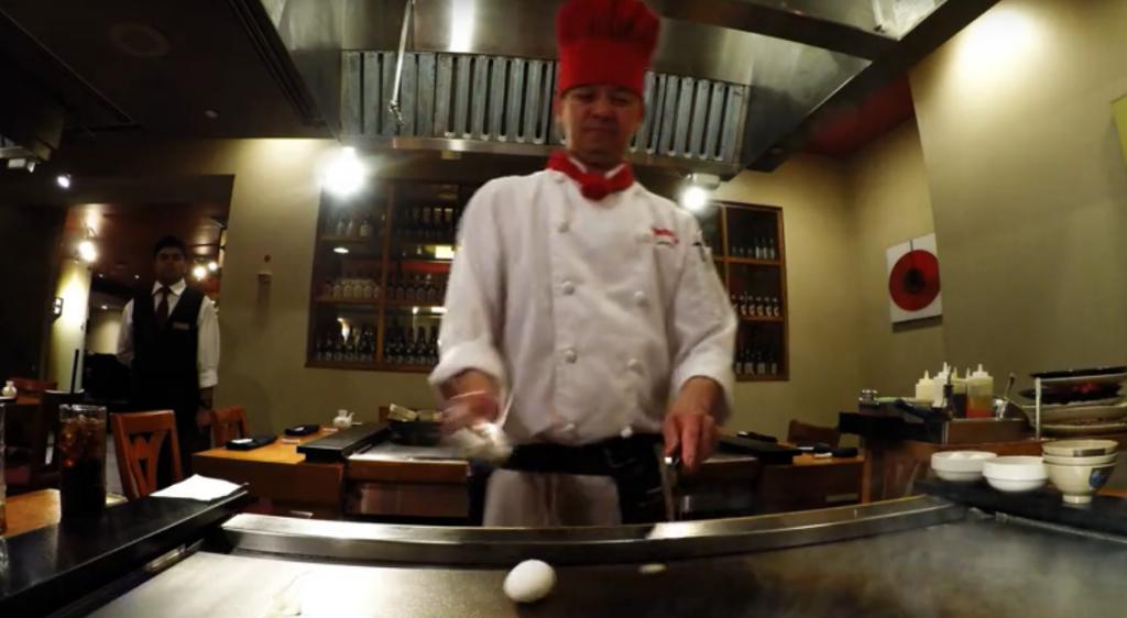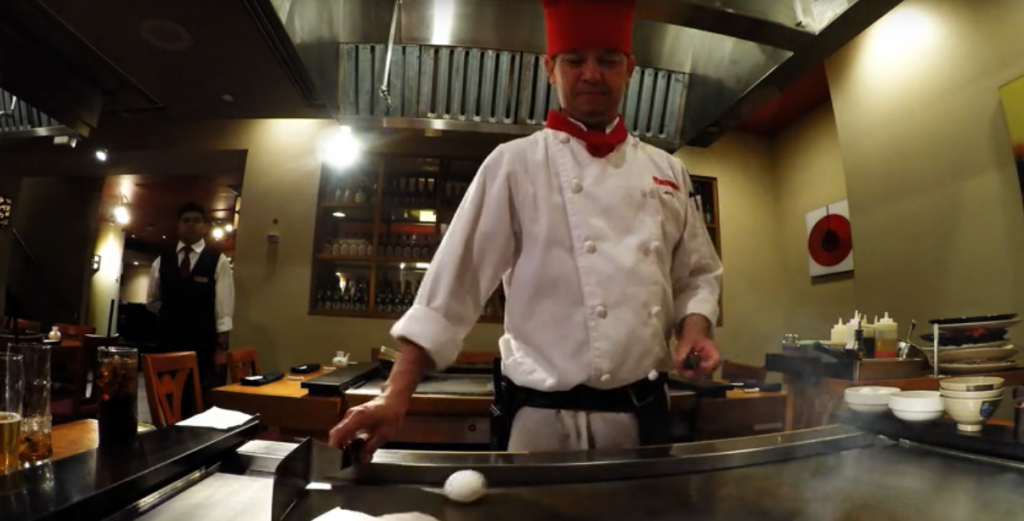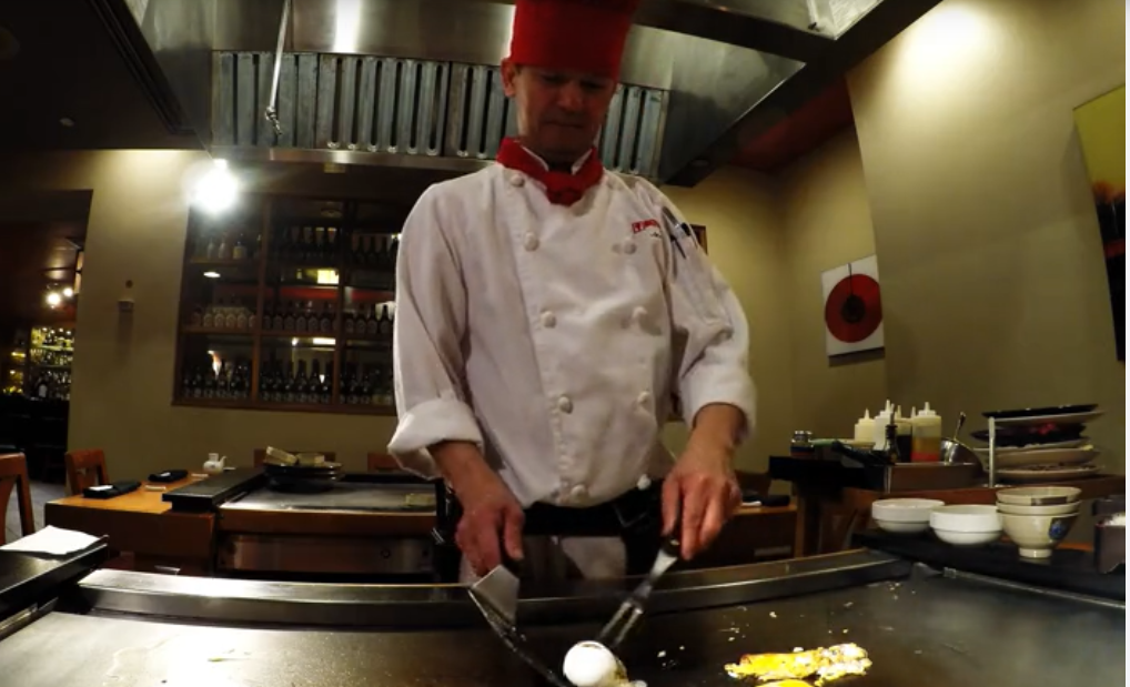 The different Japanese dishes are made using iron rods and stove. Jerry, who is a chef at the Benihana restaurant in Toronto, Ontario, is an amazing Teppanyaki master.
