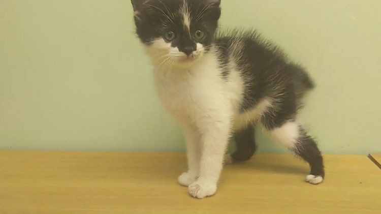 Veterinarians attached lightweight braces to the kitten’s legs to help him walk and are trying everything to return full function to his back paws. In the meantime, they are making calls for a forever home for Mr. Thomas.