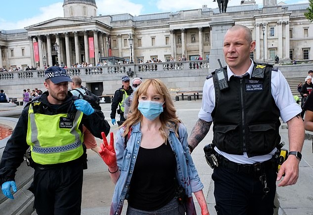 The incident occurred in London, UK, where demonstrators gathered at the Trafalgar Square to express their opinions about the pandemic and vegan lifestyle while accusing the government of having blood on their hands.