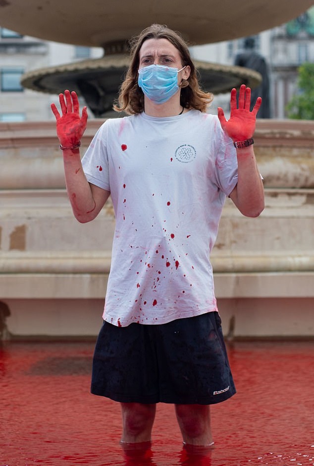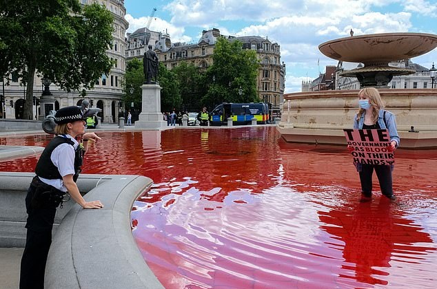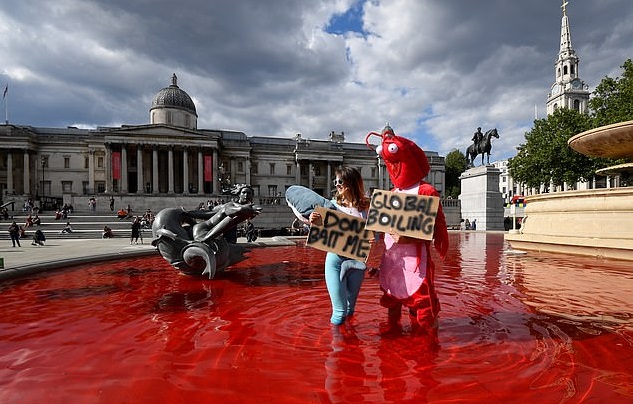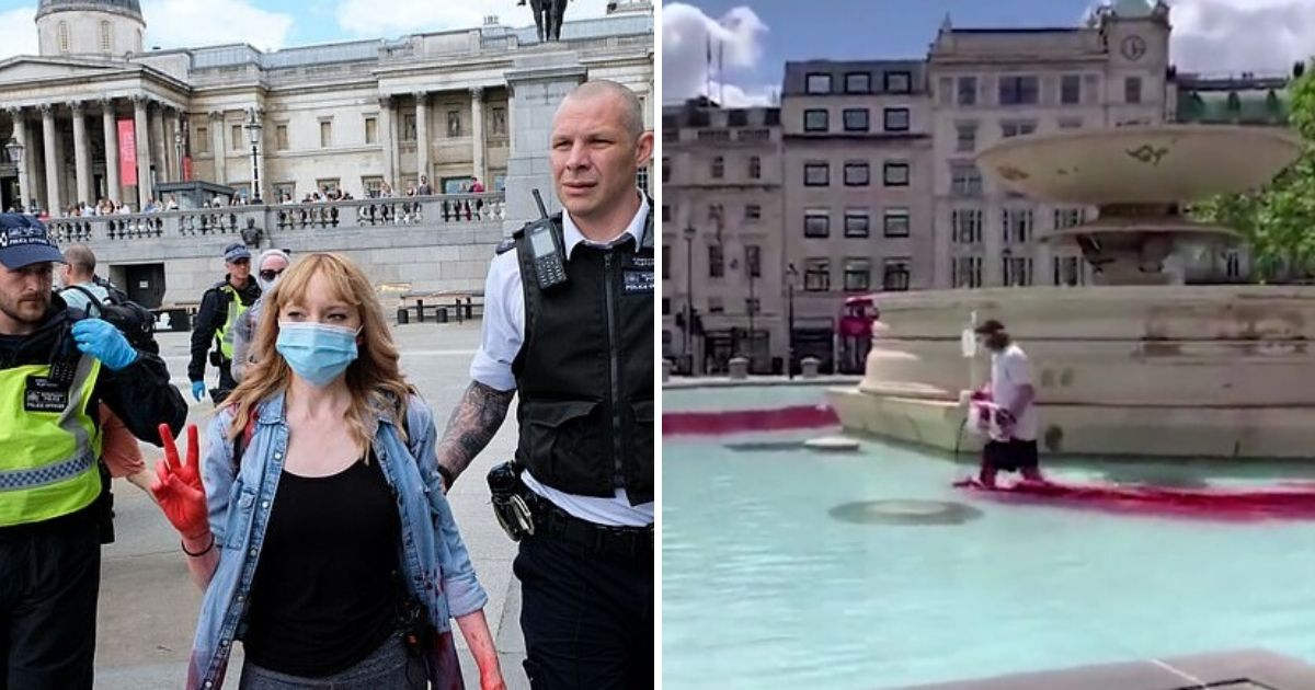 “Animal Rebellion have now dyed the Trafalgar Square fountains red, symbolizing the blood that is on the hands of the UK Government,” the group wrote in one of their posts.