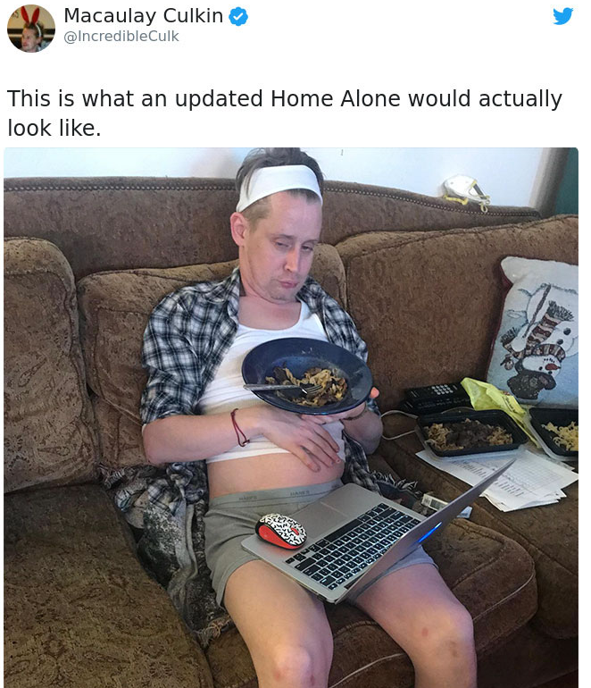 Macaulay Culkin who is 38 years old now posted a photo of himself sitting on the couch with a laptop on his lap. He was wearing a headband and a white tank top while there were game controllers all around the room.