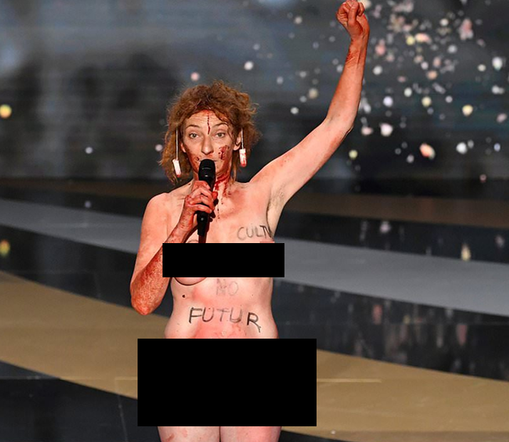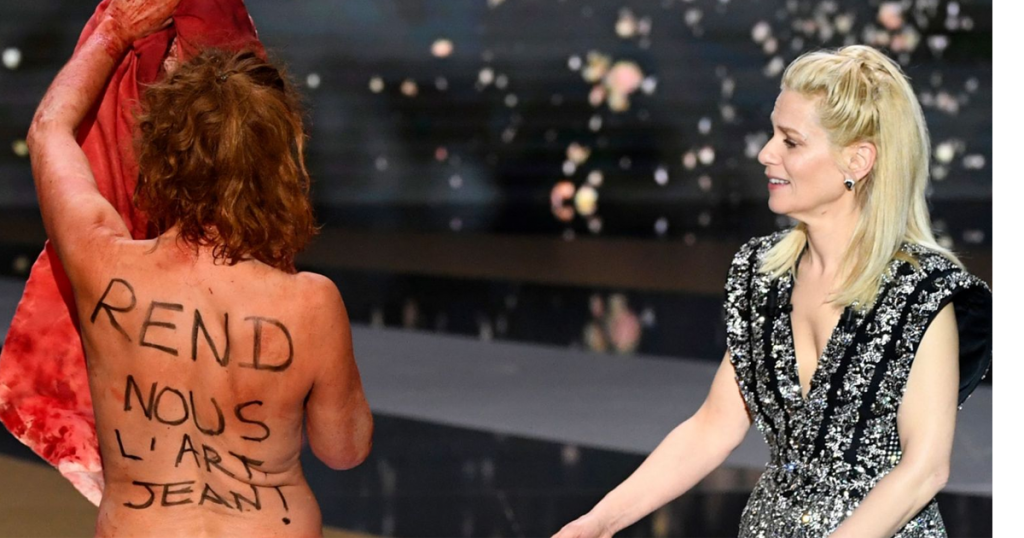 During the Cesar Awards, think of the Oscars in the United States, was in the midst of announcing the winner for the best costume design category. Connie Masiero appeared in a bloodied donkey costume, for those who don’t know, is a reference to a French fairytale before stripping naked in protest.