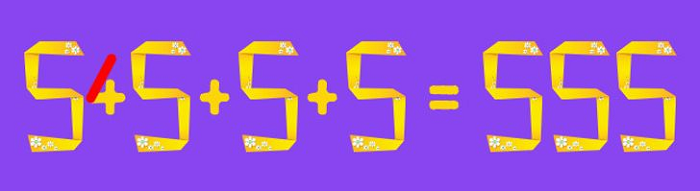 Add one diagonal line to the first plus (+) sign to make it 545 + 5 + 5 = 555. Now, it’s correct!