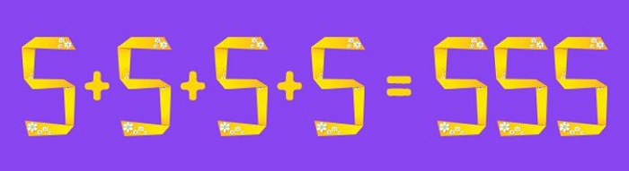 The equation shows 5 + 5 + 5 + 5 = 555. But how do you make it correct? The instruction says you can only add one line.