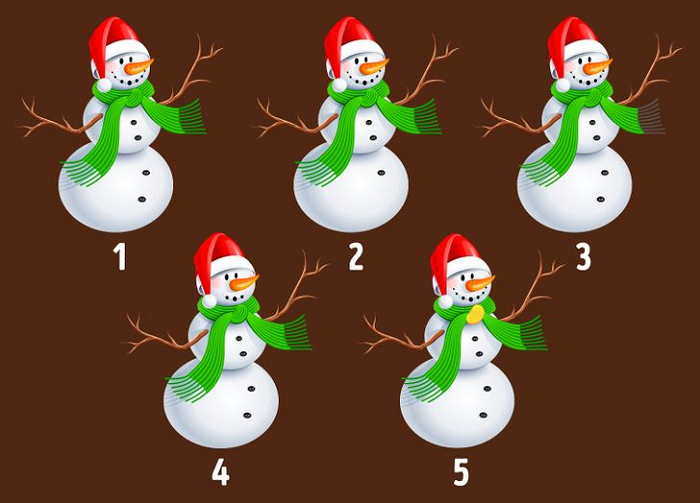 The second snowman lacks one button. The third snowman’s fringe color is different from others. The fourth snowman’s smile is shorter, and the fifth snowman’s color in the center of its scarf is different from others.