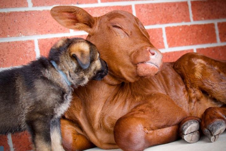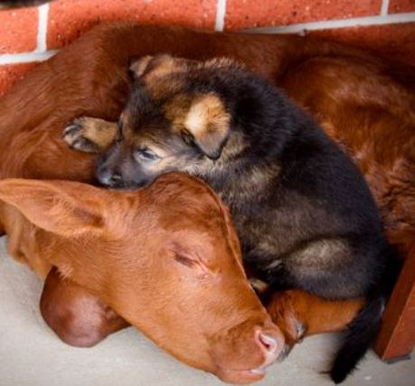 The orphaned calf just loves to spend time with his puppy friends, and now he thinks he is one of them.