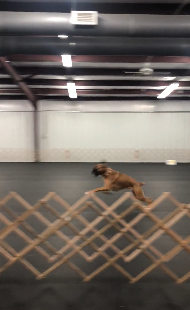 The dog was supposed to sit and wait for the owner to call for her, but then when she looked at her owner standing in front of her, she went running towards her and started celebrating the victory.