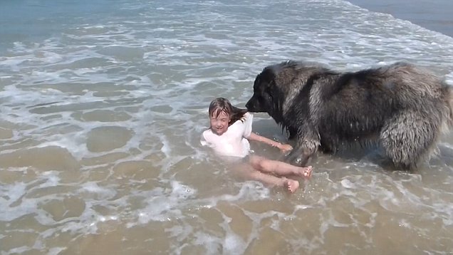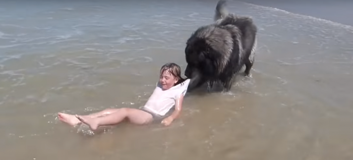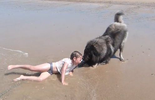 The water and the waves looked unsafe to him for the little girl. So the fluff ball dragged the girl while grabbing the neck of her top with his teeth.