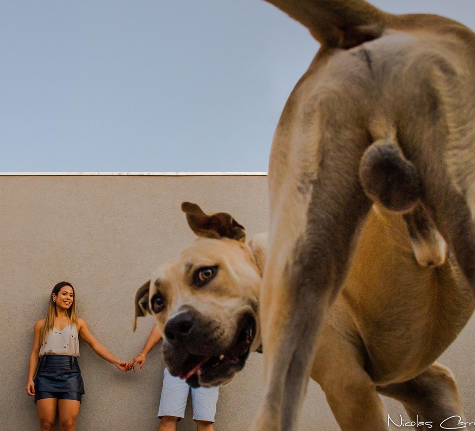 While the majority of couples prefer to come up with utterly sweet and romantic photos during their pre-wedding photoshoots, one couple from Campo Grande, Brazil, didn’t mind their dog photobombing them.