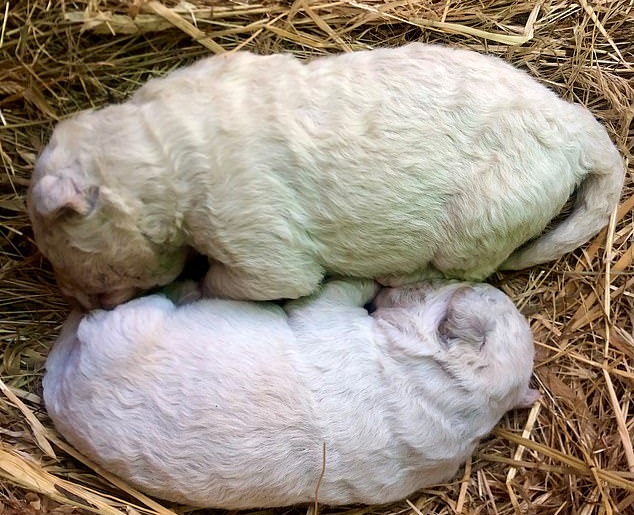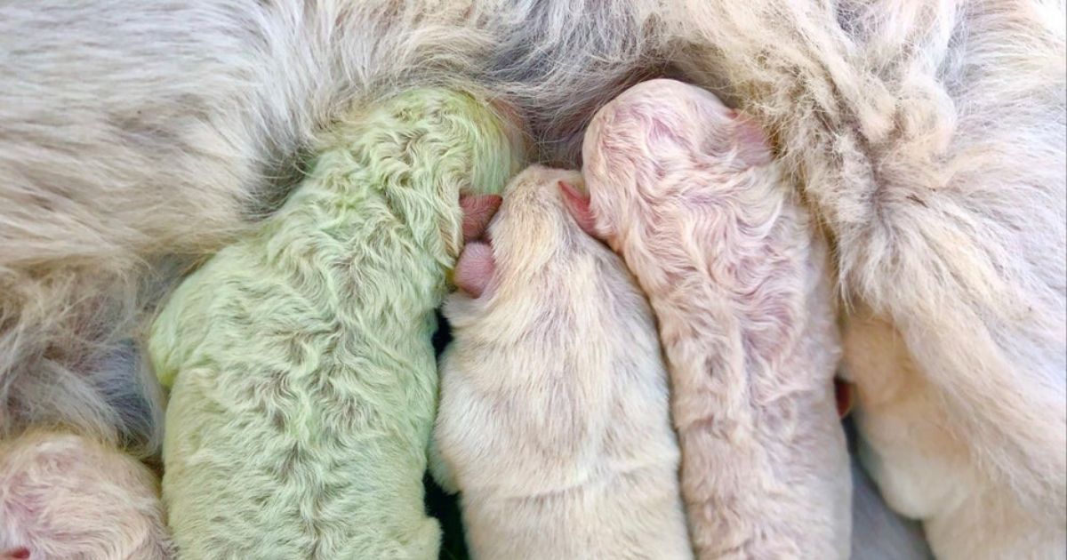 An adorable puppy was born with green fur thanks to a rare pigment that was present in his mother’s womb.