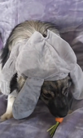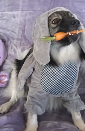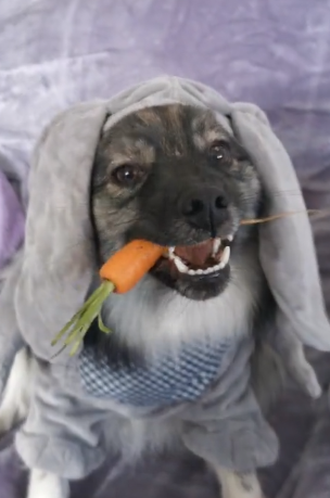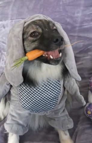 To get the exact look of the bunny, the dog also held a carrot. The dog looks alike to that of the bunny with carrot in hands. The dog is also enjoying the tasty carrot.