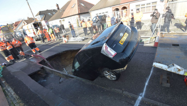 Eyewitness accounts suggest that they heard a loud bang when the sinkhole appeared. However, they thought that a fence panel had popped out at first. But when they came out of their houses, they were surprised to see the sinkhole with a car inside it.
