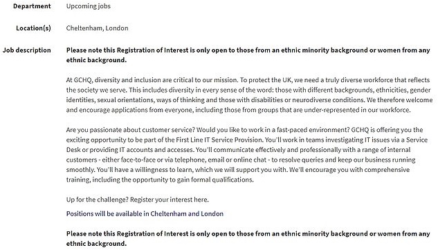In their preliminary registration, the agency called for would-be applicants to step forward while telling people that “this Registration of Interest is only open to those from an ethnic minority background or women from any ethnic background.”