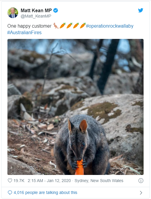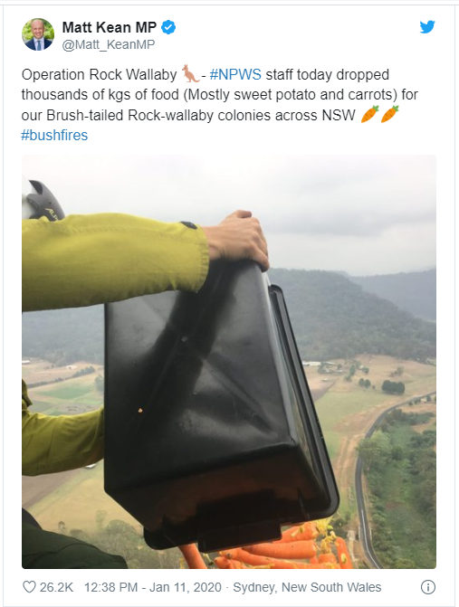 New South Wales Minister for Energy and Environment, Mathew Kean said that dropping food from helicopters was just a temporary measure taken to assist and secure the number of endangered species.