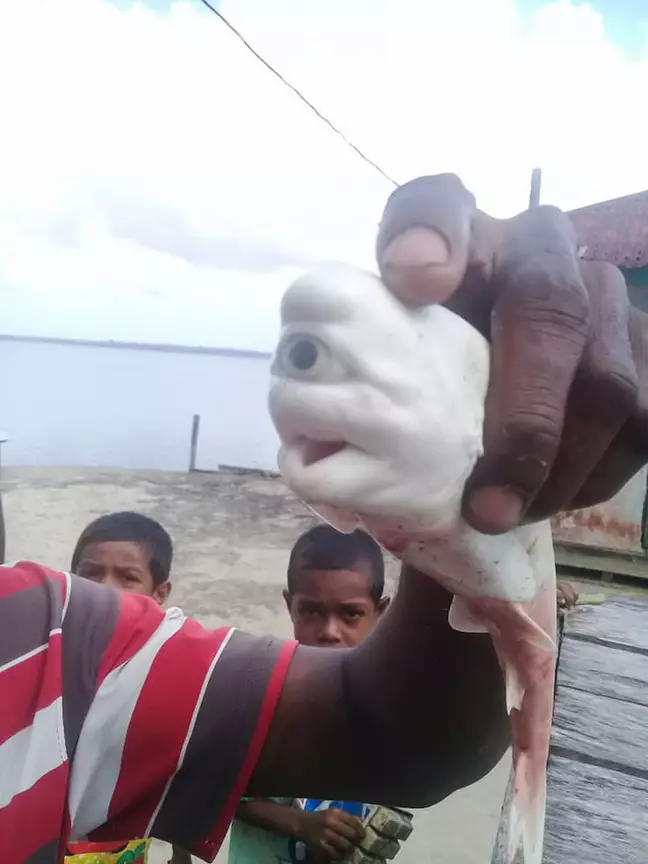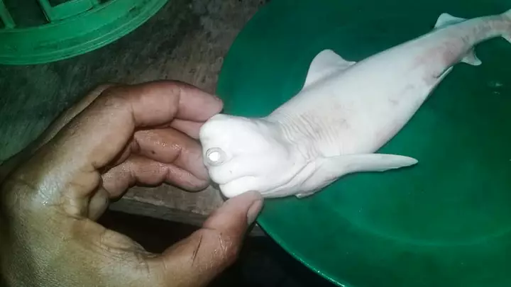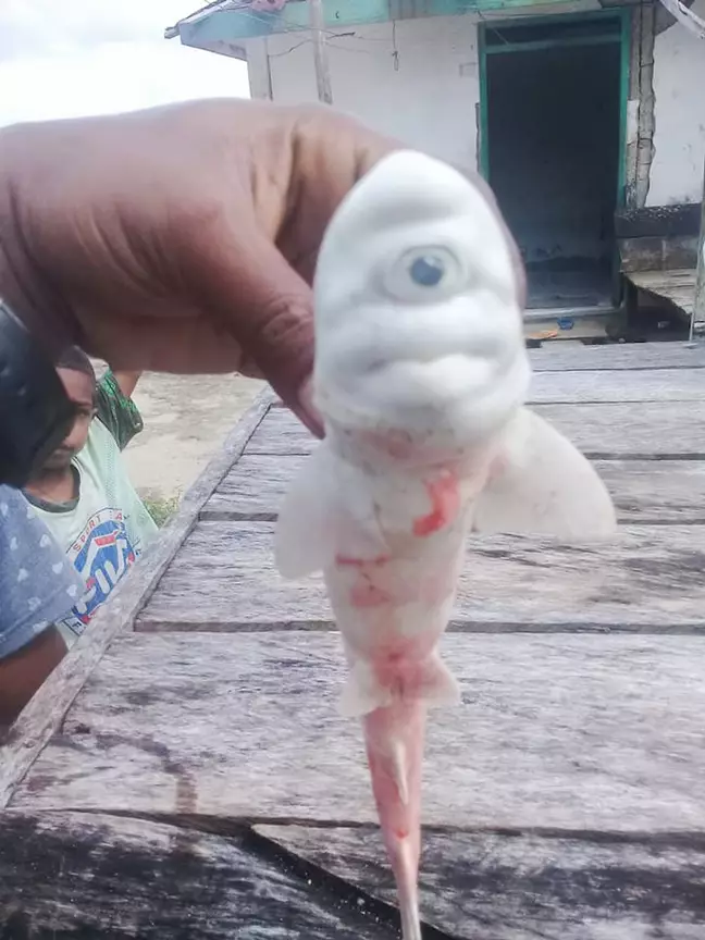 Fishermen were left baffled when they found a rare albino baby shark with only one eye.