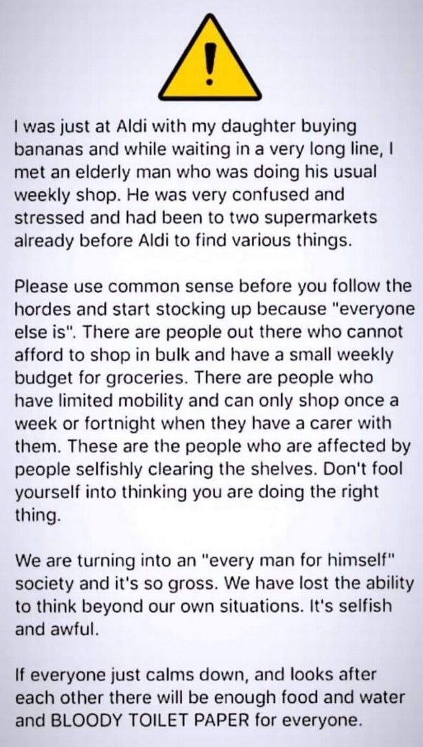 The post concluded: “There are the people who are affected by people selfishly clearing the shelves. Don’t fool yourself into thinking you are doing the right thing”.