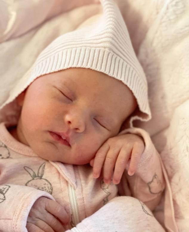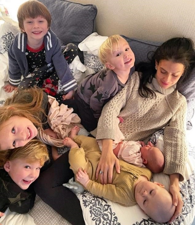 In the photo Hilaria shared, the mother of six can be seen lying in bed surrounded by her beautiful children as she cradles a newborn. The baby is wearing a pink outfit and is curled up against her mother’s stomach.